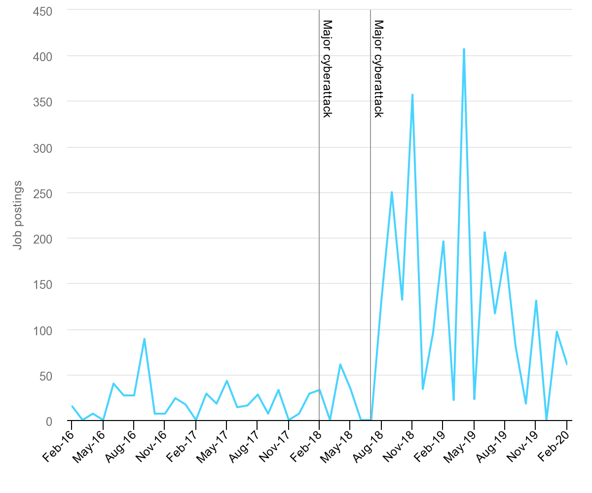 While electric power utilities across the globe already dedicate substantial budgets to cybersecurity - averaging 8% of total IT budgets in the United States and Canada - job posting data from major power utilities in the United States shows that cyberattack events trigger sudden increases in demand for cybersecurity professionals, suggesting a lack of long-term strategy or planning in the past. Smaller companies in the United States and others in developing economies could show similar behaviour in the future after suffering preventable attacks.