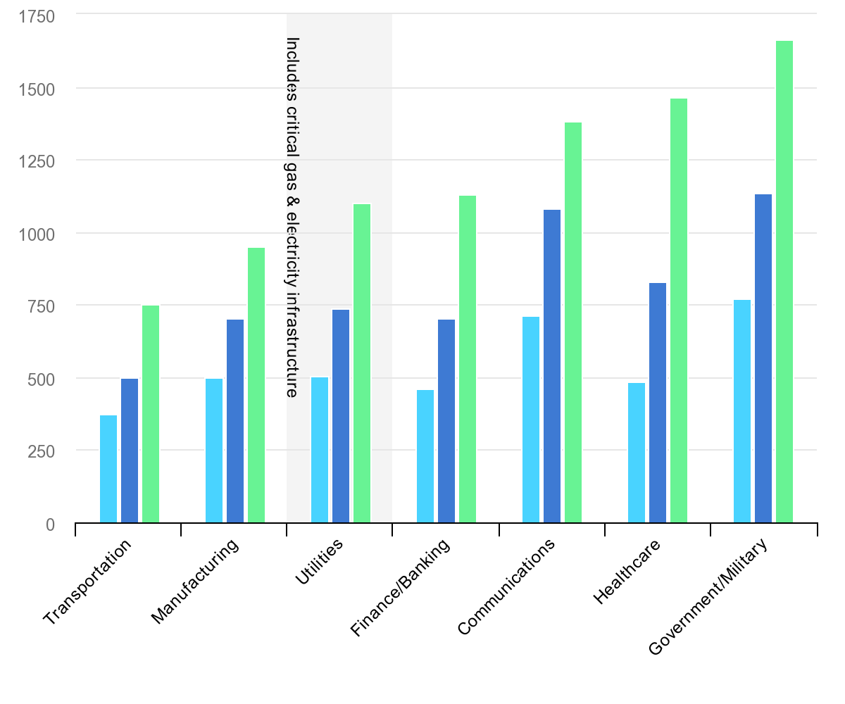 Critical infrastructure, including gas, water and particularly power utilities, are favoured targets for malicious cyber activity. The chart below points out how these industries are in the spotlight.